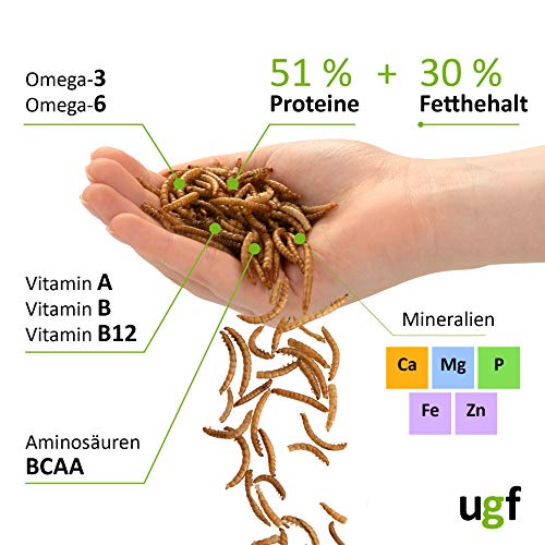 💪 PROTEIN 51% – Der getrocknet Mehlwurm ist die ideale Nahrungsergänzung des ausgewogenen Futter für Tiere. Im Einigung zu anderen Insekten hat er den am meist ausgewogenen Inhalt von Eiweißstoff und Feist. Es stellt abwechslungsreiche Ernährung für Haustiere leistungsfähig, womit die Gesundheit der erwachsenen Tiere und die Entwicklung der Jungtiere bewahrt werden.