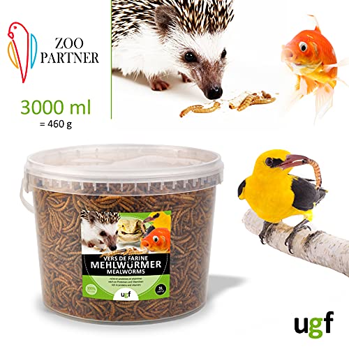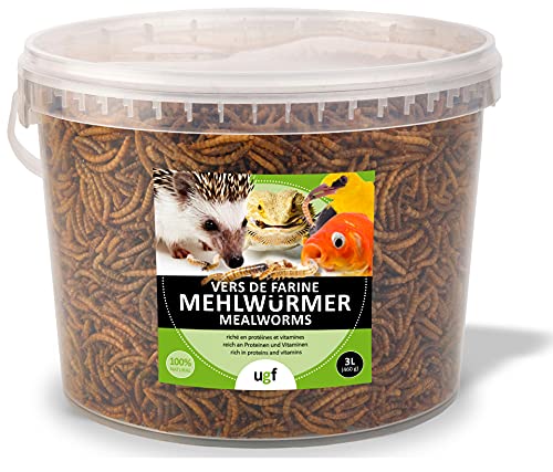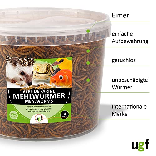 UGF – Premium Mehlwürmer Getrocknet – 460g im 3 Liter Eimer, Vogelfutter Wildvögel Ganzjährig, Igelfutter, Eichhörnchen Futter, Hamster Futter