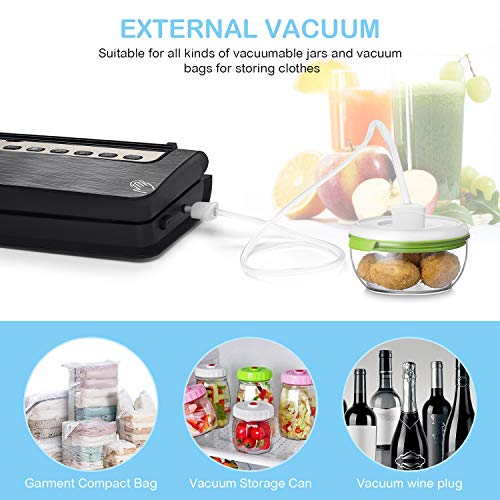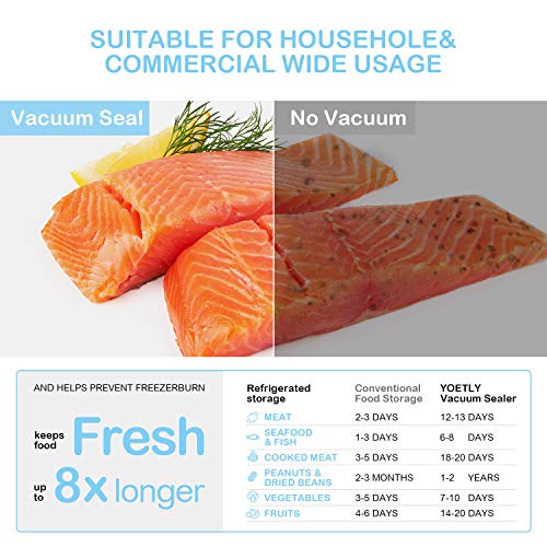8-Fache Frische-Barriere:Vakuumierer Automatisch kann die verschlechterung von lebensmitteln effektiv abbremsen und den ursprünglichen geschmack beibehalten. Geeignet für alle arten von trockenen und nassen lebensmitteln, wie fisch, fleisch, gemüse, obst, brot, rotwein usw, verrammeln sie die frische, schützen sie und familiengesundheit.