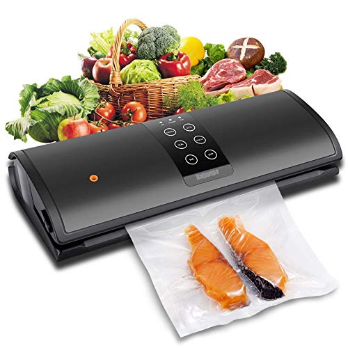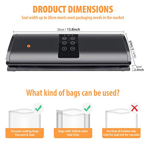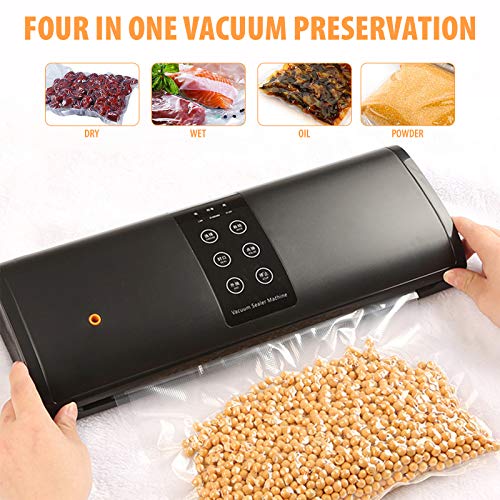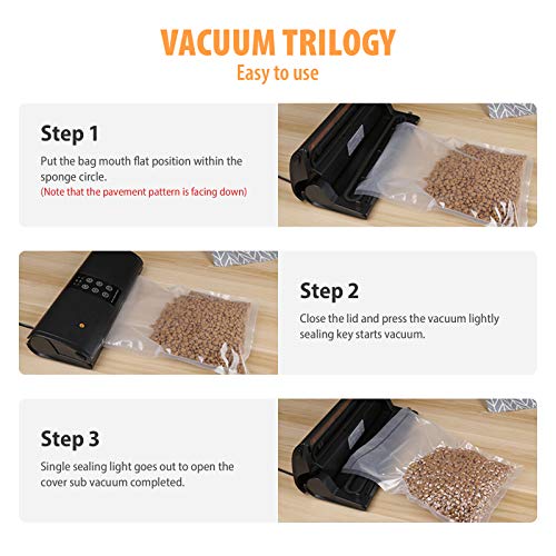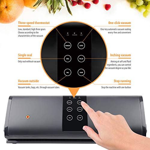 Warum sollten Sie das Vakuumiergerät für Lebensmittel verwenden? *.4-in-1-Design automatische Vakuumierer, einfache Bedienung für Anfänger. *.Eingebaute 70 kpa Doppelpumpen, super Saugkraft, kann die Luft im versiegelten Beutel schneller und leiser leiser leiten und mit besserer Dichtung. * Das Vakuumiergerät wird mit einem verstellbaren Rollbeutelhalter geliefert, der Beutelrolle von 6,5 – 28 cm Breite unterstützt. *.Schnelle Wärmeableitung und automatischer Überhitzungsschutz. Verhindert Verbrennungen bei hohen Temperaturen und schützt Sie und Ihre Familie. *.Themachine ist mit einem 28 cm langen Wärmestreifen ausgestattet, der das Isolieren mehrerer Beutel gleichzeitig unterstützt. * Mit einer Berührung können Sie einfach stimmen, ob Sie ein trockenes oder mit Feuchtigkeit versiegeln. * „Stop“-Taste zur Steuerung der Geschwindigkeit für zerbrechliche Lebensmittel. *.Kompakte Größe, nimmt nicht viel Platz auf Ihrer Küchenarbeitsplatte ein und ist leicht zu verstauen. * Mit glatter Oberfläche und abnehmbarem Boden, der sehr leicht zu reinigen ist. *.VacuumMachine kann auf eine Vielzahl von Lebensmitteln angewendet werden, einschließlich Tierprodukte, Gemüse, bereits gekochte Lebensmittel oder Teig usw. Spezifikationen: Farbe: Schwarz. Nennspannung: 100–240 V. Leistung: 120 W. Maximale Abdichtungsbreite: 28 cm. Breite des Heizstreifens: 3 mm. Versiegelungszeit: 6 ~ 12 Sekunden, relativer Vakuumgrad: -60 bis -70 kPa. Geräuschwert: Weniger als 70 dB, Produktmaße: 35 x 13 x 6 cm. Bitte beachten Sie: Die Beutelgröße sollte nicht breiter als 28 cm sein. Bitte reinigen Sie Ihr Gerät nach jedem Gebrauch, um eine optimale Leistung und lebensmittelecht zu gewährleisten. Es wird empfohlen, Vakuumbeutel mit Textur auf beiden Seiten zu verwenden, glatte Beutel können im Unterschied dazu zum Schließen und nicht zum Vakuumieren verwendet werden. Lieferumfang: 1 x Vakuumiergerät für Lebensmittel, 10 x Vakuumbeutel, 1 x Bedienungsanleitung (evtl. nicht in deutscher Sprache).