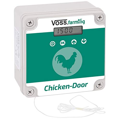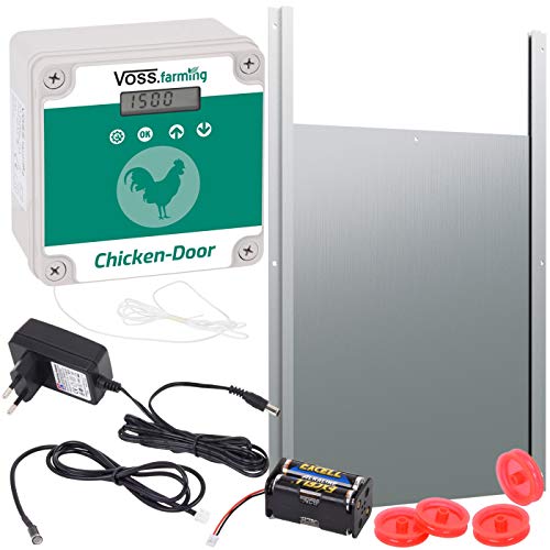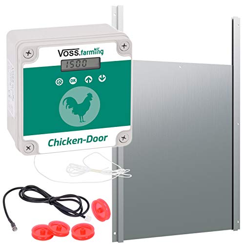 VOSS.farming Set Chicken-Door automatische Hühnertür + Alu Hühnerklappe 300 x 400mm, Türöffnung, Türöffner für Hühnerstall, Hühnerhaus, mit Lichtsensor, Zeitschaltung, Manuell