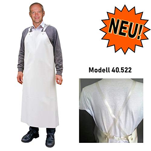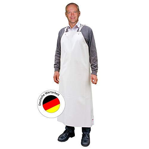 GUTTASYN – DIE BEWÄHRTE UND BELASTBARE MARKENFOLIE Die wasserfeste weiße Arbeits-Schürze aus PVC ist 0,5 my dick, hat eine Länge von 120 cm, eine Breite von 90 cm und ist aus der Markenfolie „Guttasyn„ gefertigt. Die GUTTASYN Materialien aus Deutschland sind absolut wasserdicht und bekannt für eine lange Lebensdauer und eine hohe Resistenz gegen die meisten Säuren, Laugen und Fette