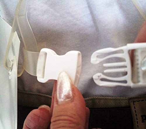 ALLE BÄNDER VERSTELLBAR Die Träger lassen sich durch Steckschließen am Latz lösen, siehe Bild. Das ist jedoch nicht notwendig, man kann ganz leicht und einfach in die Schürze schlüpfen – auch ohne die PVC Träger zu lösen. Durch die Überkreuzführung der Träger erhält die Schürze den „runden Drall“ nach hinten und umrundet und schützt den Körper automatisch. Wer trotzdem den festen Halt in der Taille braucht, der schließt die quersitzende Rückenschließe zusätzlich