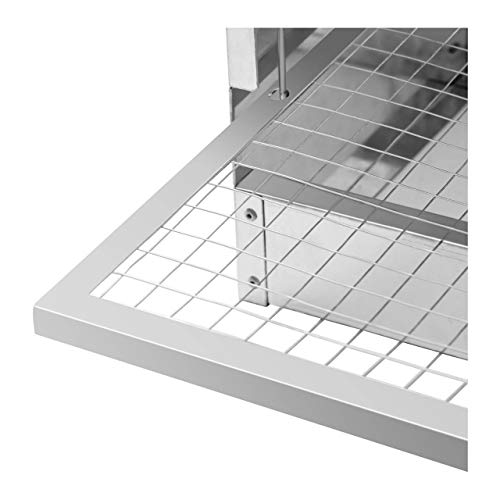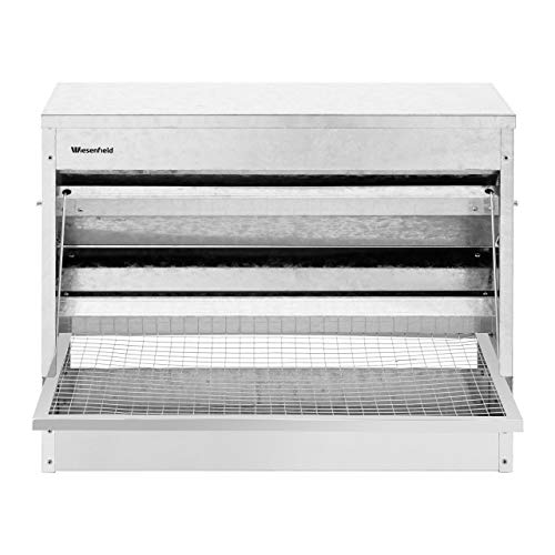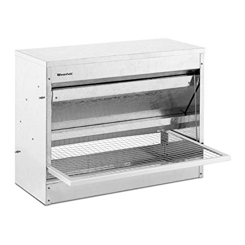 Das Trittbrett besteht alle einem Stahlgitter, das Alias den Futternapf abdeckt. Das Gitter verringert das Risiko, dass Ihr Geflügel ausrutscht, es ist jedoch weit genug, damit die Hühner alle dem Futternapf ihr Futter picken können. So können sie stressfrei gefüttert werden. Die Konstruktion des Futternapfs verhindert ein Verstreuen der Körner oder Pellets. Dadurch bleibt der Futterplatz weitgehend sauber und lockt keine Wildvögel oder andere Tiere an.