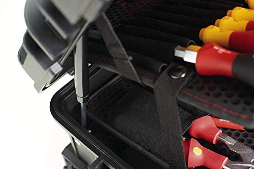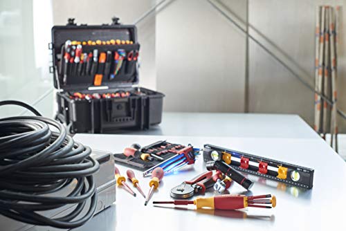 Herkömmliche Werkzeugkoffer sind immer wieder nicht robust genug, haben wenig Stauraum und die Werkzeuge sind schwer zugänglich. Diese Mängel wurden bei der Entwicklung des 115-teiligen Elektriker Competence XXL II Koffers von Wiha ein für alle Mal beseitigt. Die Werkzeugeinlagen dieses Koffers sind mit Blick auf eine effiziente Arbeitsweise so konzipiert, dass alle Werkzeuge schnell und einfach entnehmbar sind. Durch die umfangreiche Ausstattung haben Elektriker für jede Anwendung das passende Utensil parat, wie zum Beispiel den Magazin Bithalter LiftUp electric, ein Drehmoment-Schraubendreher Set, vollisolierte Schraubendreher aus der Wiha Slim Familie oder die Installationszange TriCut. Im großen Stauraum des Werkzeugkoffers ist zudem eine speziell auf Elektrikeranwendungen ausgelegte Wasserwaage enthalten. Der aus robustem Polypropylen Kunststoff bestehende Koffer ist zusätzlich mit Gasdruckdämpfern ausgestattet, die den Deckel in verschiedenen Positionen halten und vermeiden, dass er automatisch zufällt und Verletzungen vermeidet.