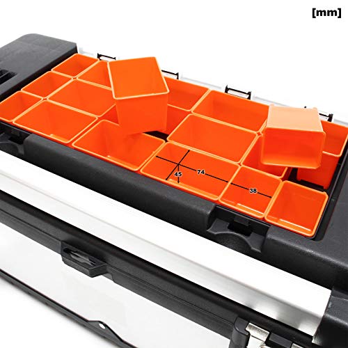 Der Koffer zeichnet sich durch seine Dauerhaftigkeit und seine komfortable Nutzung jeder. Im Inneren befindet sich ein Werkzeugträger, der bei Bedarf herausgenommen werden kann. Der Werkzeugträger weist mehrere Fächer in unterschiedlichen Größen auf. Das ermöglicht es Ihnen, lange Arbeitsgeräte als Schraubenzieher und Hammer oder kürzere Werkzeuge als zum Beispiel Stecknüsse geschützt zu transportieren.