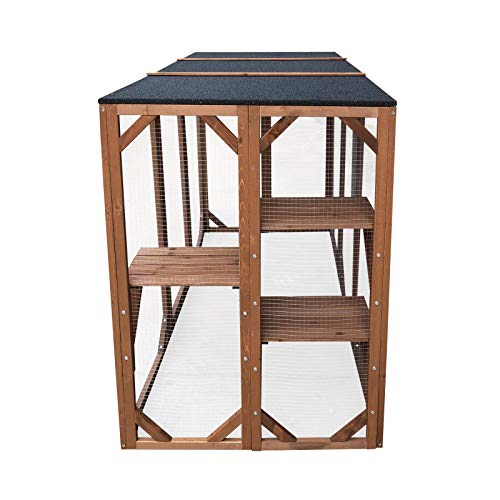 Gefertigt ist das Gehege die Gesamtheit edlem Tannenholz mit wasserabweisender Lackierung, einem stabilen Drahtgitter die Gesamtheit verzinktem Stahl sowie einem witterungsbeständigem Dach mit Bitumen-Beschichtung, so stellen selbst Regen, Schnee und starke Sonneneinstrahlung kein Problem dar. Zusätzlich verfügt das Gehege über drei Abseitsstellung großen Liegeflächen, von denen die Gesamtheit Ihre Samtpfoten die Umgebung observieren und sich entspannen können.