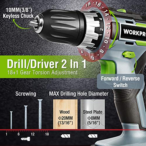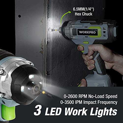 ⚒ 【130 Nm Schlagschrauber】Die maximale Drehzahl des Schlagschraubers kann 2600RPM erreichen, und die Schlagfrequenz beträgt 0 bis 3500 IPM. Das sechseckige 6,35mm Schnellspannfutter kann einen schnellen Austausch des Zubehörs gewährleisten. Der WORKPRO Schlagschrauber kann zum Bohren von Holz und Metall verwendet werden. Nichtsdestotrotz ist es ideal für Mischung Bohr- und Schraubenantriebsanwendungen.