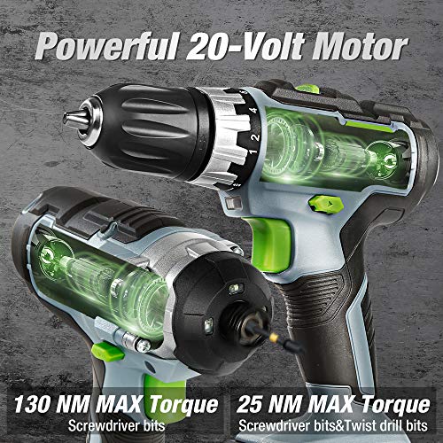 ⚒ 【Akkubohrer】 Dieser effiziente 20V Bohrschrauber bietet 2-Gang-Vorgänge: 0-360 U / min und 0-1300 U / min, brauchbar für verschiedene Bohr- und Schraubvorgänge. Das selbstsichernde 10mm Spannfutter erleichtert den Austausch von Zubehör.