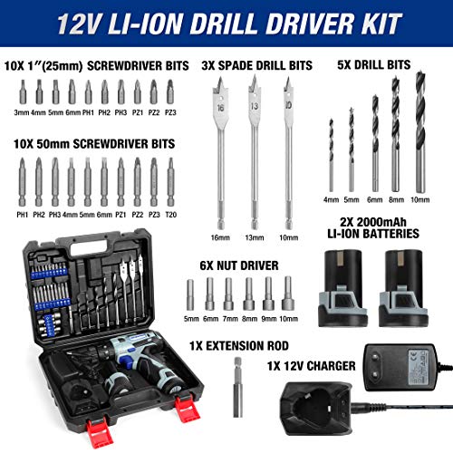 🌟【𝙇𝙄𝙀𝙁𝙀𝙍𝙐𝙈𝙁𝘼𝙉𝙂】1 x aufladbare Batterie Bohrmaschine 12V;1 x Schnellladegerät,1 x Werkzeugskoffer; 6 x Steckschlüssel(5/6/7/8/9/10mm) ;10 x 50mm Bits (PH1,PH2,PH3,PZ1,PZ2,PZ3,4,5,6mm) ;10 x 25mm Bits (PH1,PH2,PH3,PZ1,PZ2,PZ3,T20,3,4,5,6mm);5 x Spiralbohrer anstatt Holz(4,5,6,8,10mm); 3 x Flachbohrer anstatt Holz(10,13,16mm);1 x 60mm Erweiterung; 2 x Lithium-Ionen-aufladbare Batterie.