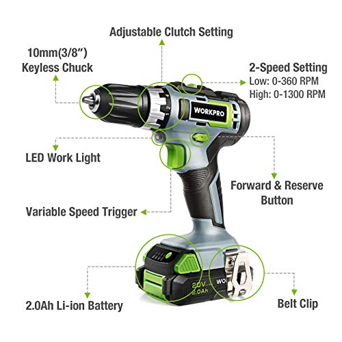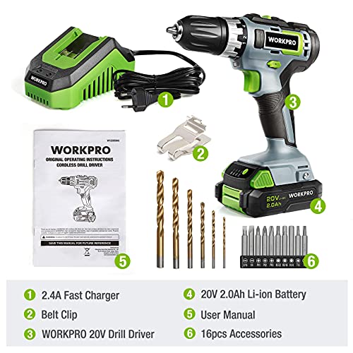 WORKPRO Akkuschrauber 18V/20V Akku-Bohrschrauber mit 16 Zubehör, Drehmoment 25NM und variable Drehzahlen, LED-Licht, 2…