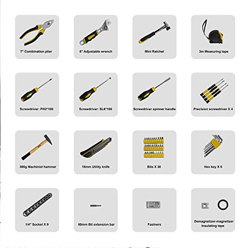 【KOMPLETTES WERKZEUGSATZ】 Das Kit enthält einen verstellbaren Schraubenschlüssel, 2 Stück Schraubendreher, 4 Stück Präzisionsschraubendreher, 1 Stück Schraubendrehergriff und verschiedene Bits, eine 7-Zoll-Zange, einen Inbusschlüsselsatz, einen Hammer, ein Isolierband, ein Maßband usw. .