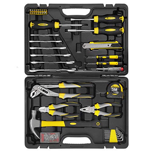 【KOMPLETTES WERKZEUGSATZ】 Das Kit enthält 6tlg Kopie-Maulschlüssel, 6″ Kombizange und Seitenschneider, 10″ Wasserpumpenzange, Maßband, 8OZ Klauenhammer, Sechskantschlüssel und Bits usw.