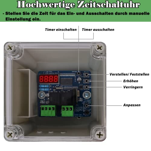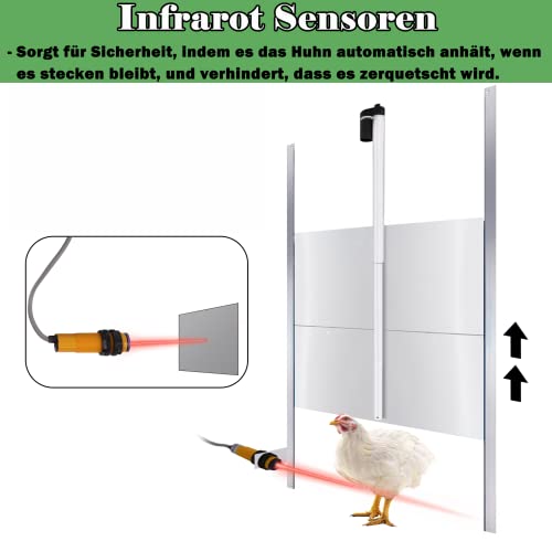 【Infrarotsensor Design und Timer】:Mit Infrarotsensor, wenn Ihr Huhn unter der Tür stecken bleibt, wird der Motor Puller zu Ende bringen zu laufen. Schützt Ihre Hühner vor Quetschungen und sorgt für einen sicheren Betrieb. Mit der Zeitschaltuhr können Sie das Öffnen und Verallgemeinern der Tür zu verschiedenen Zeiten selbst steuern.