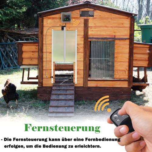 Mit der Timer-Schaubild können Sie die Zeit des Öffnens und Schließens der Tür des Hühnerstalls selbst einstellen. Mit zwei transparenten Schlüsseln kann die Stalltür auch über eine Fernbedienung gesteuert werden.