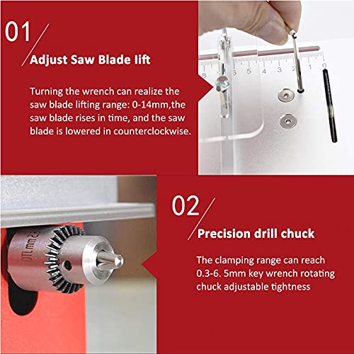 Diese kleine multifunktionale Tischkreissäge hat ein ohne Lücke geschlossenes Metallgehäuse und ein Vakuumrohr, sodass Sie sich keine Sorgen um Staub machen müssen. Klein und tragbar, geeignet für DIY handgefertigten Modellbau und Abmähen von Holz, Holzstäbchen, Metall, Kunststoff und anderen kleinen Gegenständen