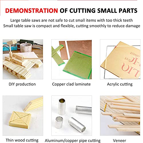 2. Diese Tischkreissäge eignet sich daher zum Herstellen von kleinen Materialien wie Heimwerken / Leiterplatten / Basteln / Modellen und Abmähen (große Holzbretter, Gegenstände usw., die die Höhe des Sägeblatts überschreiten, bitte nicht kaufen)