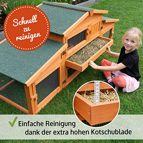 SCHNELLE REINIGUNG – Durch die extra hohe Schublade und dem zu öffnenden Dach lässt sich die Hasenvilla (Kaninchengehege, Holzhütte, Kanninchenkäfig, Kleintier Käfig) für draussen leicht reinigen.