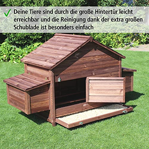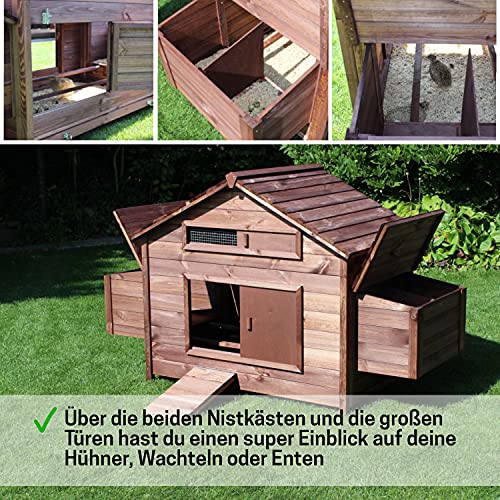 PREMIUM – zooprinz Hühnerstall über 2 Nistkästen über Dach zum anbrechen, große xxl Kotschublade, Hühnerrampe und Schiebetür vorne. Zugunsten leichten Einblick sorgt die große Hintertür