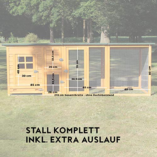 DELUXE MODELL – großes Hühnergehege FLEXI (215cm Gesamtlänge) mit zusätzlichem Auslauf – XXL Freilaufgehege Hühner mit 4 Türen, leicht zugänglich, Haupthaus mit großem Dach zum Öffnen