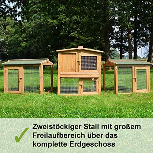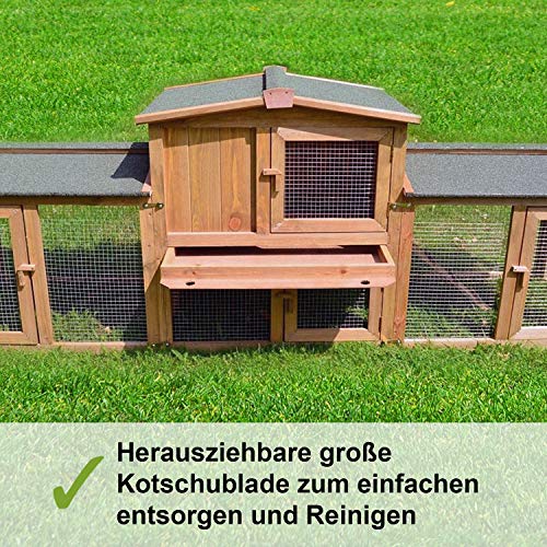 🐰 Dank der witterungsbeständigen Lasur ist der Stall optimal als Außenstall zu nutzen. Die Dächer sind wetterfest und mit Teerpappe bezogen. Durch die Kotschublade lässt sich das Hasenhaus innen schnell reinigen. Das Gehege ist mit Hasengitter ausgestattet und bietet so Schutz vor Räubern und anderen Kleintieren.