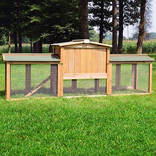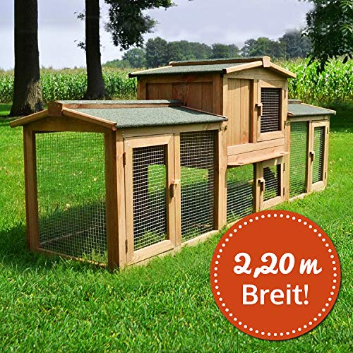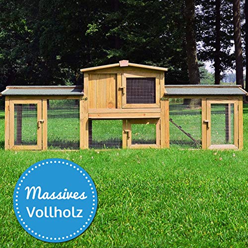 🐰 Kleintier-Stall inkl. 2 x XXL Gehege-Bereichen am Hasenhaus. Enorme Gesamt-Breite circa. 2,26m. Ideal für Kaninchen, Hasen, Meerschweinchen und andere Nagetiere. Das Kaninchenhaus zwischen den beiden Freigehegen hat zwei Etagen.